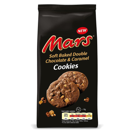 Biscotti morbidi di cioccolato con pezzetti di cioccoalto al latte, gocce di cioccolato al caramello e pezzetti di fudge aromatizzati al caramello.