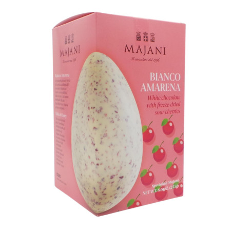 Uovo di Cioccolato bianco con granella di amarene liofilizzate (6%).