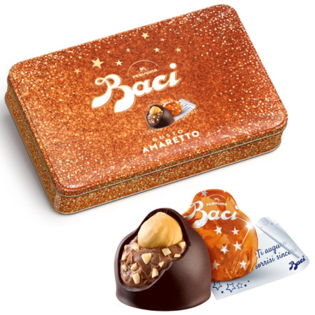 Baci perugina gusto amaretto sono cioccolatini ricoperti di cioccolato fondente luisa al gusto di biscotto amaretto con nocciola intera, cuore al gianduia e granella di mandorle. Un cioccolatino che si ispira alla tradizione italiana delle feste in una confezione regalo per sorprendere e da condividere durante il periodo di festa. Confezione ed incarto con grafiche festive e scintillanti, rese ancora più speciali dal messaggio di auguri all'interno di ogni cioccolatino.