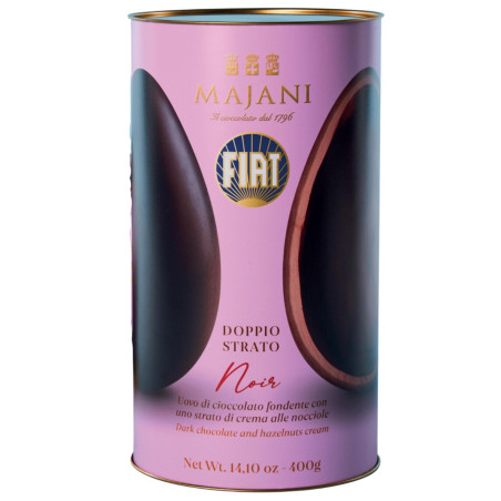 Nuova confezione tubolare per l’uovo bi-strato guscio di finissimo cioccolato fondente extra con uno strato di crema Fiat Noir, g 400.Uovo di finissimo cioccolato fondente extra (cacao: 53% min) con strato interno (45%) di crema FIAT NOIR alle nocciole (13%).