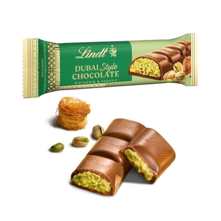 La barretta Snack Dubai Style Chocolate 40g è una creazione esclusiva firmata Lindt, un guscio croccante racchiude un cuore sorprendentemente morbido e cremoso, con il 45% di pistacchio nel ripieno. La croccantezza è esaltata dalla presenza di mandorle e pistacchi, mentre il kadayif conferisce una consistenza originale e raffinata. Un incontro di ingredienti selezionati che rende ogni assaggio un’esperienza sensoriale unica.