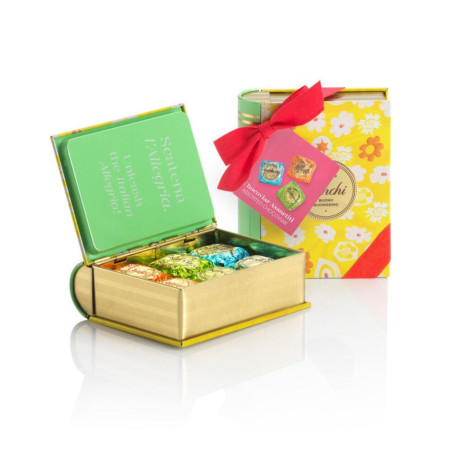 Lattina in metallo verde a forma di mini libro contenente Chocoviar Crème Brulée e Crème Cacao un regalo super goloso per il periodo natalizio.
