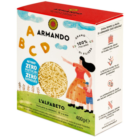 La pastina Alfabeto di Armando salta fuori da un libro di scuola per animare piatti in brodo o minestre genuine e divertenti. Le piccole lettere gustose solleticano il palato e riempiono la tavola di chiacchiere saporite.