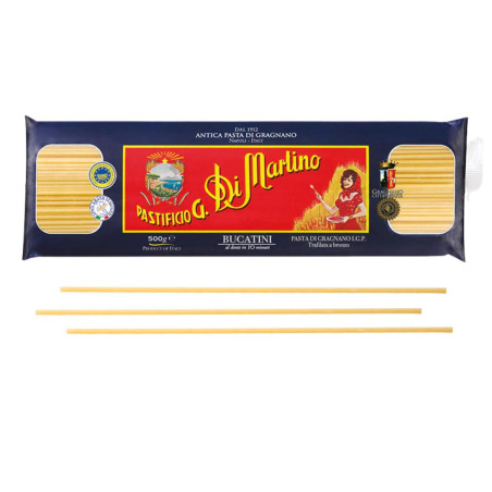 Famosi nel mondo per il classico abbinamento con i piatti più apprezzati della tradizione romana, come la carbonara, i Bucatini sono un formato lungo caratterizzato da un foro centrale, che li rende molto versatili e leggeri. Strepitosi se preparati secondo la ricetta tipica campana con coniglio all’ischitana. Nelle giornate autunnali o invernali sono invece perfetti se spezzati e cotti direttamente in una avvolgente zuppa di legumi.Pasta di Gragnano certificata IGP, trafilata al bronzo, essiccata lentamente a basse temperature, prodotta con semola di grano duro 100% italiano e acqua di sorgente locale. Contiene un minimo del 14% di proteine, consistente alla cottura e altamente digeribile.