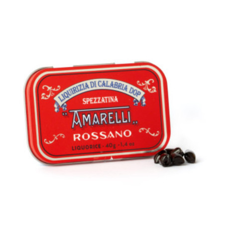 La Spezzatina di liquirizia pura a pasta dura è raccolta in una confezione di metallo da 40g,