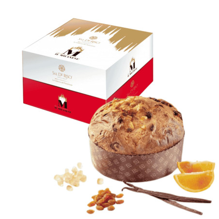 farina di GRANO tipo 0 e 00, BURRO fresco (16,60%), bucce d’arancia candita (10,80%) (bucce d’arancia, zucchero, sciroppo di glucosio, acqua), tuorli D’UOVA freschi pastorizzati di categoria "A" (10,22%), zucchero, uvetta sultanina Australiana (9,7%) (uva, olio vegetale), cedro Diamante candito (6,5%) (cedro Diamante, zucchero, sciroppo di glucosio, acqua), acqua, lievito naturale da rinfresco (GLUTINE), miele di acacia Italiano, sale, pasta di arancia candita (1,20%), LATTE in polvere, malto D’ORZO, bacche di vaniglia in polvere delle Isole Bourbon e Tahiti.