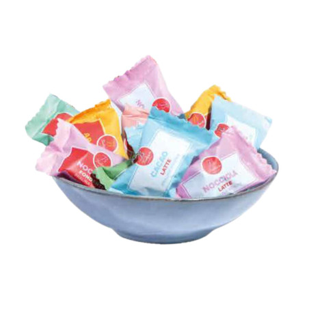 Ogni cioccolatino racchiude al suo interno un morbido ripieno. Incartati singolarmente e assortiti tra cui latte, fondente, pistacchio, cacao, amaretto, arancia, caffè, menta, fondente 70%, nocciola, zabaione.