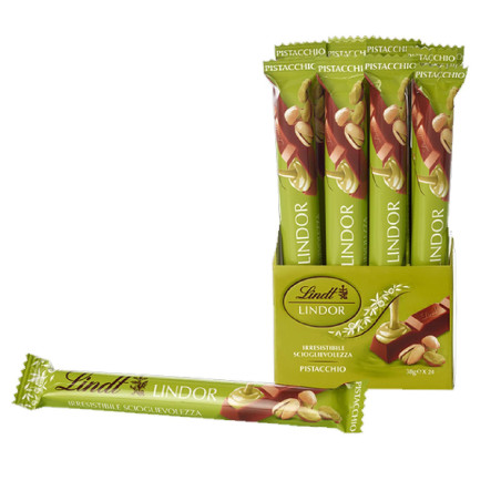 Nel tuo snack Lindor Pistacchio trovi tutta la ricchezza del finissimo cioccolato Lindt al latte con un cuore di dolce pistacchio dall'irresistibile scioglievolezza in formato tascabile: un goloso stick da 38 grammi per un momento di golosità quando più ne hai bisogno. Uno stick unico, l’inconfondibile firma dei Maîtres Chocolatiers Lindt, un gusto iconico per ogni tua pausa. Dal 1949 i nostri Maîtres Chocolatiers Lindt avvolgono con cura ogni Lindor, per regalarti un momento di irresistibile scioglievolezza.Ingredienti: CIOCCOLATO AL LATTE CON MORBIDO RIPIENO AL PISTACCHIO Ingredienti: zucchero, burro di cacao, grasso vegetale (cocco, palmisti), LATTE intero in polvere, pasta di cacao, LATTE scremato in polvere, LATTOSIO, pasta di PISTACCHI (1,5%), aromi, emulsionante (lecitina di SOIA), estratto di malto d’ORZO. Può contenere NOCCIOLE ed altra FRUTTA A GUSCIO. Esterno: Cioccolato al latte - Cacao: 30% minimo. SENZA GLUTINE.