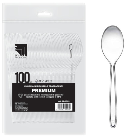 Cucchiaini in PS polistirene e di colore trasparente.Cucchiaini Riutilizzabili e lavabili. Resistono fino a 25 cicli di lavaggio a 65°. La confezione è composta da 100 cucchiaini. Prodotto idoneo per bevande e alimenti a base acquosa, acida ed alcolica a temperatura ambiente o inferiore per periodi di tempo prolungati. Non utilizzare in forno o forno a microonde. Il prodotto va smaltito nella plastica.