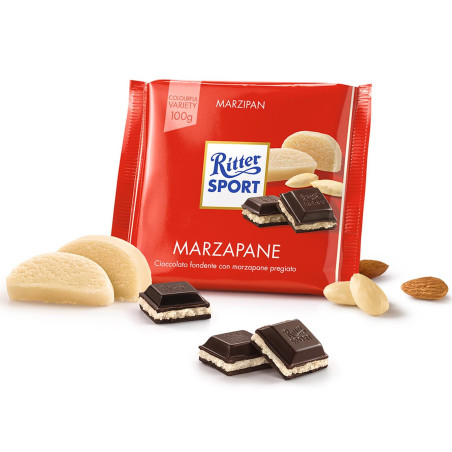 Ritter Sport 100g Marzapane è la tavoletta di cioccolato nota per la sua squisita farcitura, nata dalla combinazione di mandorle dolci californiane e un pizzico di mandorle amare di qualità rinomata che danno vita a un marzapane straordinario.