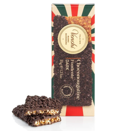 L'iconica granella Nougatine Venchi si unisce al sapore intenso del cioccolato fondente 60% e alle microperle Chocoviar 75% dando vita ad uno snack dal gusto deciso di Nocciola Piemonte IGP. Ideale da avere sempre con sé per una pausa gustosissima.