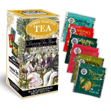 Dispenser in cartone contenente 30 filtri laminati salvaroma di tè neri di Ceylon aromatizzati in 6 gusti assortiti. Peso 30X2gr.