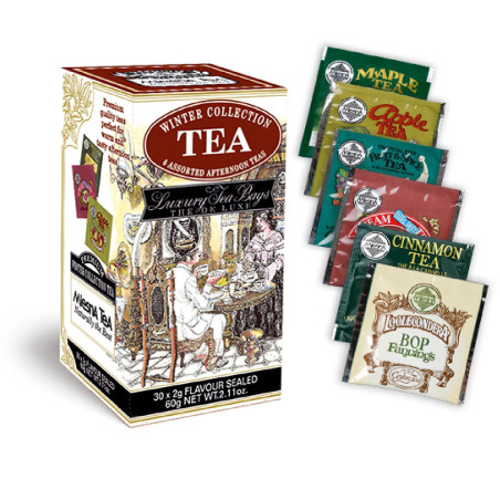 Dispenser in cartone contenente 30 filtri laminati salvaroma di tè neri di Ceylon aromatizzati in 6 gusti assortiti. Peso 30X2gr.